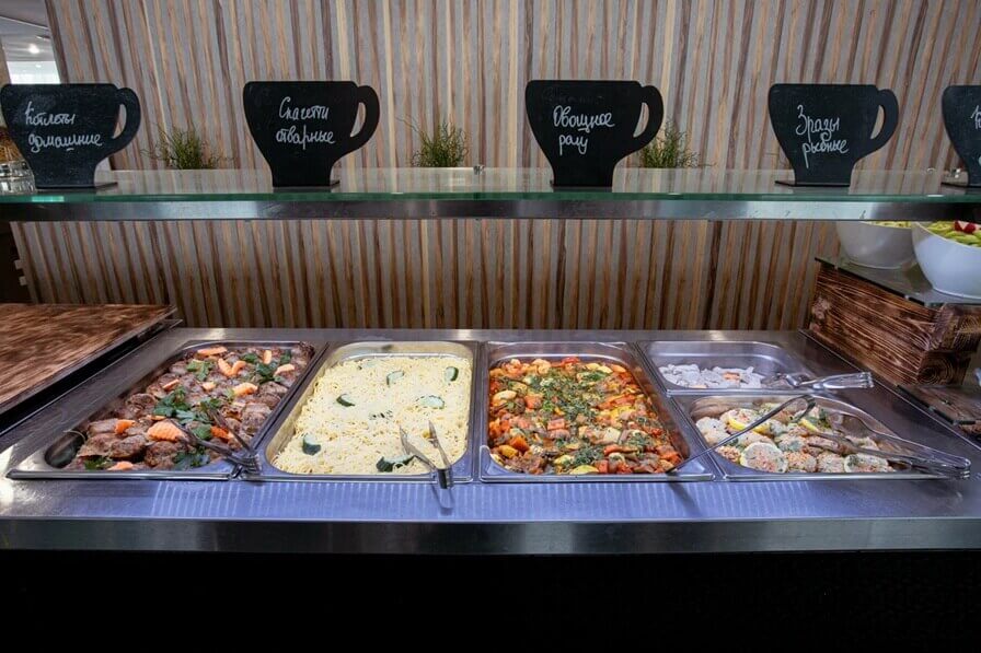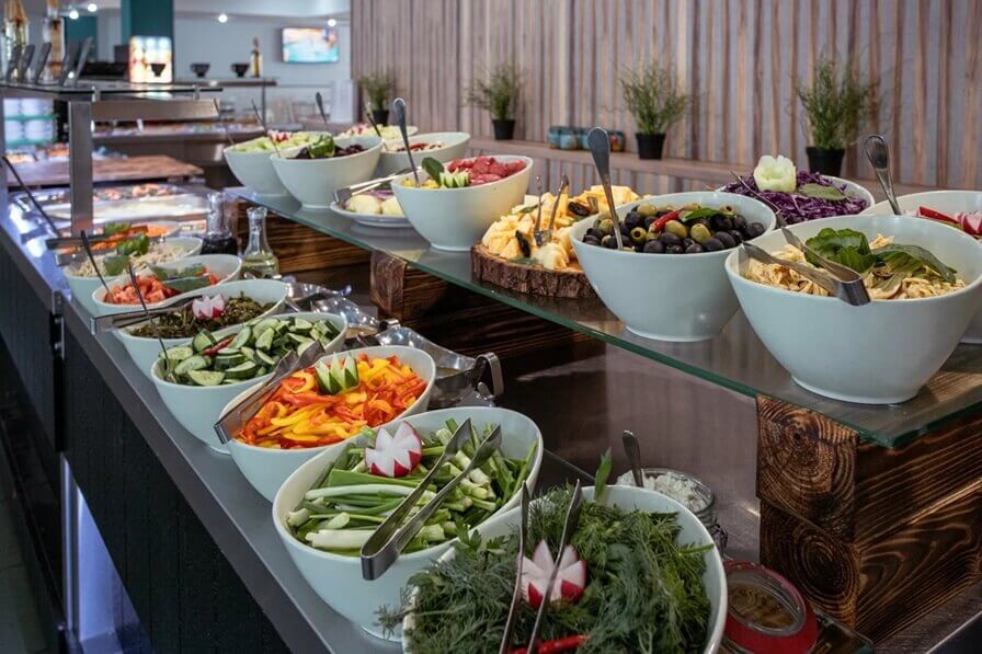 Ассортимент блюд на шведской линии: свежие салаты и закуски, горячие супы, основные блюда из мяса и рыбы, разнообразные гарниры и выпечка, безалкогольные напитки.