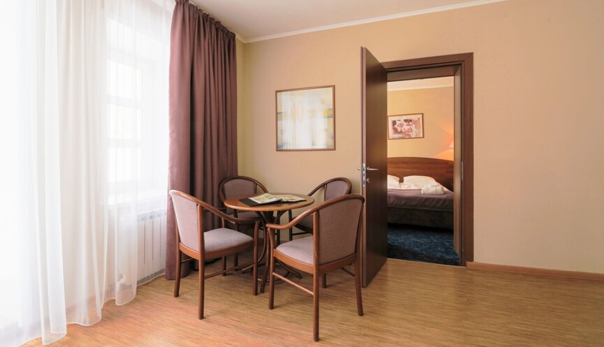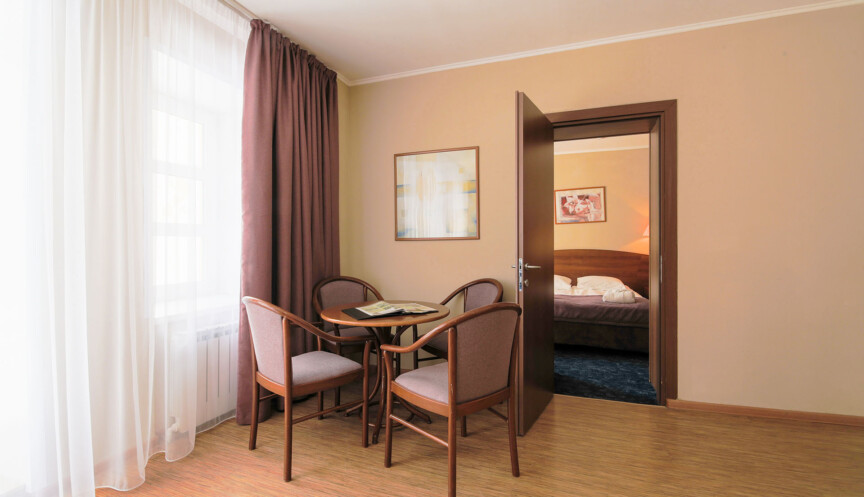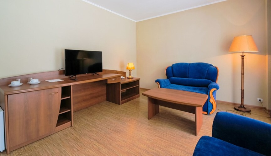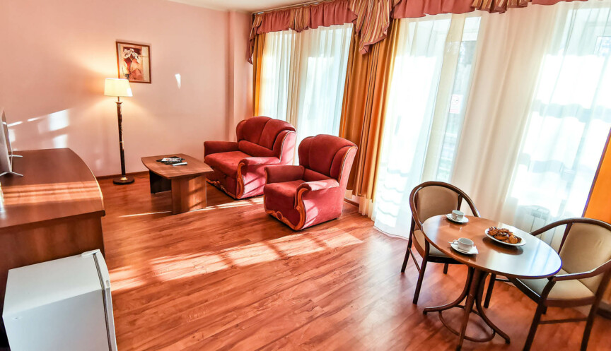 Номер категории «Люкс двухкомнатный» — это просторный двухэтажный номер, который вмещает до 3 человек. В люксе предусмотрено два основных места — широкая двуспальная кровать в спальне на втором этаже, также можно поставить дополнительное место в гостиной для третьего гостя. Люкс отлично подходит для комфортного отдыха пары, родителей с ребенком или друзей. Особенно удобно располагаться с маленьким ребенком, потому что номер без лестницы и при этом большой.