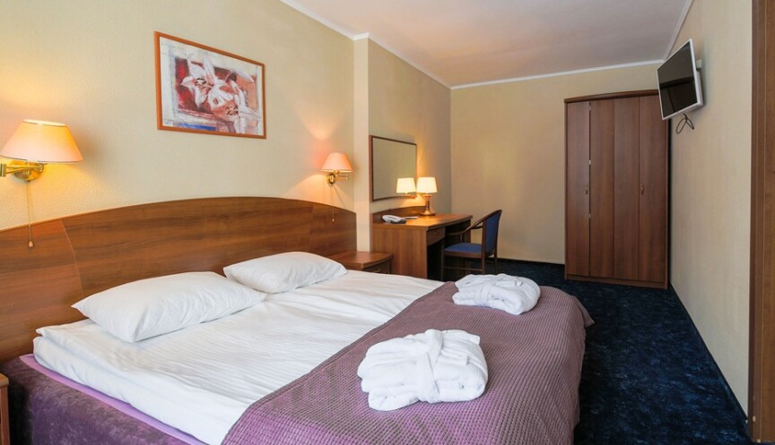 - Комната 2: двуспальная кровать, 2 прикроватные тумбочки, туалетный столик и полукресло, шкаф. В каждой комнате телефон, телевизор