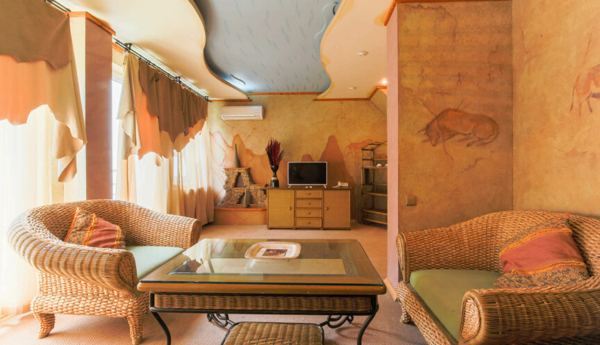 — Сафари — дикая саванна, наскальная живопись в оформлении интерьера, натуральные цвета и плетеная мебель;